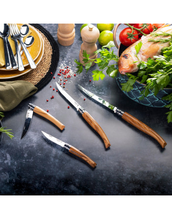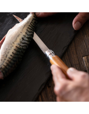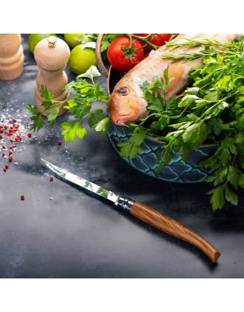 Un manche à la silhouette épurée en olivier, une virole de sécurité Virobloc bloquant la lame en position ouverte et fermée et une lame poliglace de 15 cm en acier inoxydable. Le couteau idéal pour lever les filets de poisson grâce à sa lame souple, fine et pointue.