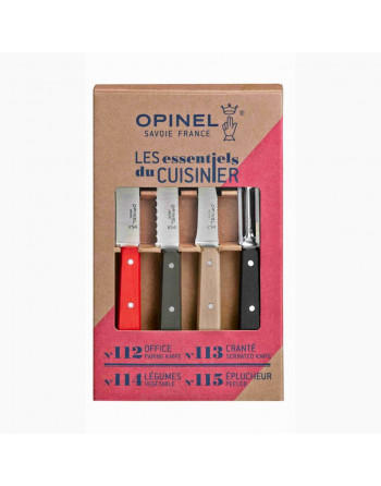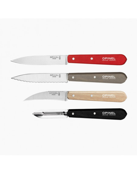 Inspiration Classic Design ! Le Coffret est composé des 4 couteaux indispensables pour la cuisine : le couteau d'Office, le couteau Cranté, le couteau à légumes, et l'éplucheur. Les manches sont lasurés et vernis. Couteau d'office, couteau cranté et éplucheur fabriqués en France. Couteau à légume fabriqué au Portugal.